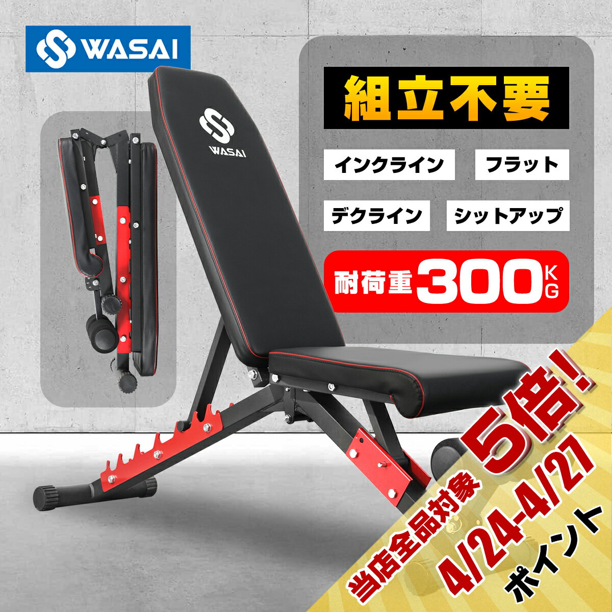 トレーニングベンチ インクラインベンチ フラットベンチ 腹筋 シットアップベンチ 筋トレベンチ 【組立不要/収納便利/瞬時角度調節】耐荷重300KG WASAI MK037