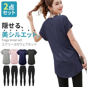 送料無料¥2,980Yahoo!ショッピングエアリーヨガウェアセット ヨガウェア トップス レギンスセット 半袖 ヨガtシャツセット ピラティスウェアセット ジムウェアセット トレーニングウェアセット
